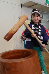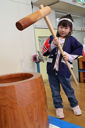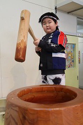 | 大きな臼を前に、たくましい構えの年中さん♪力強くお餅をつきました! |