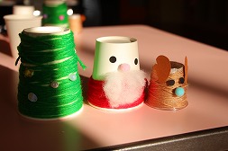 | 紙コップにながーい毛糸を巻いて、ツリーとサンタさんとトナカイさんを作ったよ♪ |