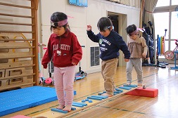 | ホールでサーキット運動をしたよ!ケンケンパも平均台も上手になりました♪ |