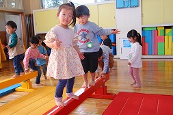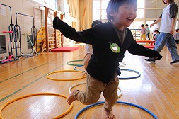 ホールでサーキット運動をしたよ!ケンケンパも平均台も上手になりました♪ |