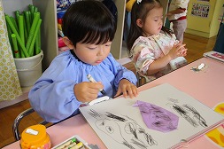 | 鯉のぼりさんの下で大きな紙にお絵描きしたよ♪真剣に色を選んでいますね☆ |