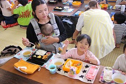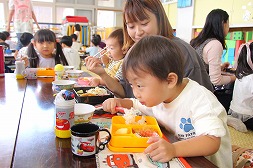 たくさん森で遊んだ後は一緒に給食を食べたよ!嬉しい1日になったね☆ |