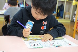 | 今日は1年生になりきって、ひらがなドリルに挑戦です☆チャイムで「起立!」の号令も。 |