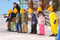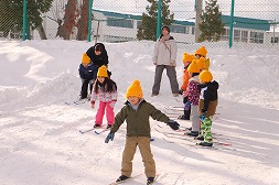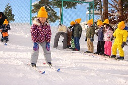 | 園庭に雪山が完成し、年長さんが歩くスキーの取り組みをスタートしました! |