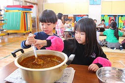 | ぐるぐるお鍋をかき混ぜて、心のこもった特製カレーの出来上がり!! |